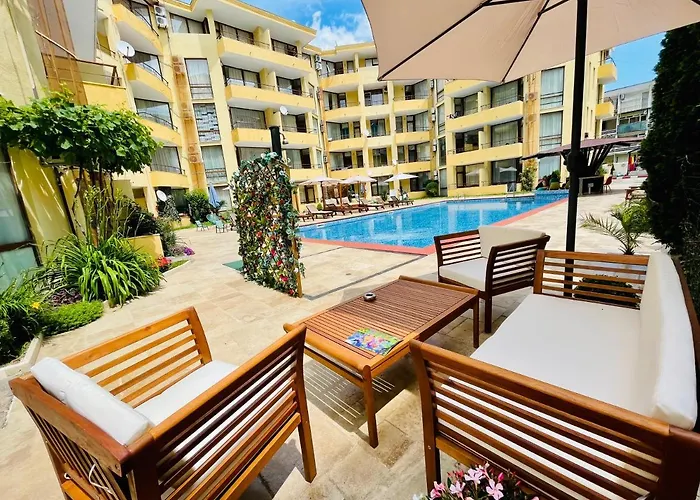 El hotel está situado en una zona verde de Sunny Beach, a 2 km del centro. El Circuito de Karts está a unos metros de este hotel, mientras que la estación de autobuses la Strandzha, está a una distancia de tan solo 5 minutos andando.